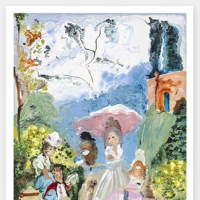 Incorporating sourced imagery of royalty from the seventeenth and eighteenth centuries, Figgis engages in an ongoing dialogue with the court painter tradition, exploring the absurdity of history and power dynamics — subjects deeply related to her Irish heritage — through depictions of English aristocracy, grandiose architecture, and baroque fashion. By means of her distinctly anti-academic aesthetic, which features motifs that are, at turns, psychedelic and grotesque, Figgis' work implies a sense of distrust in authority figures and accepted dogmas, instead relegating them to a place of ridicule and farce.