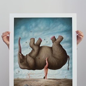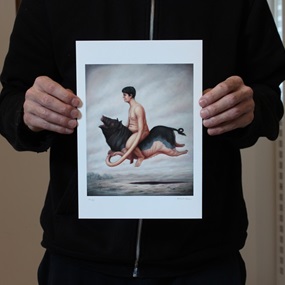 Bruno Pontiroli creates mind-bending explorations of the relationship between humans and animals. From his dreamlike visions, he conjures up surreal and fantastic universes, where centaurs cut off the head of half-human half-horse creatures, over-eager men can embrace large walrus or jump on twisted giraffes and dromedaries fit their cubic-shaped humps into each other. A poetic and absurd ability to make the impossible happen, while an hippopotamus is standing on his tongue...