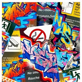 Nasty started painting graffiti in 1988. He became famous painting coloured frescoes in the Paris metro. His name appears on the metro tunnels, on the banks of the Seine and along railways. He has exhibited at the Palais de Chaillot, at Magda Danisz art gallery... Today, he is represented by Bailly Contemporain art gallery in Paris. He is part the prestigious ADG Art Collection which exhibited in 2009 at the Grand Palais. His unique painted signs of the Paris metro are a true success at Urban Art auctions (Artcurial, Drouot...). Arte TV Channel produced a documentary about him in 2009.