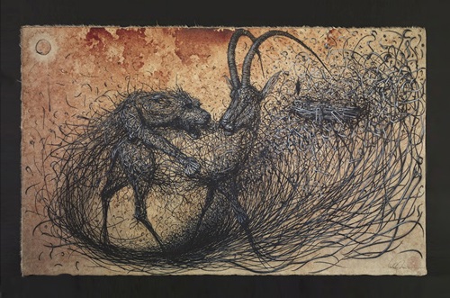 “egariM is my first lithograph, depicting one of the latest scene from my work, which catches an instant of the shifting moment. The performers standing in the realm of impermanence. By looking at each individual character, one can catch the emotions such as hope and fear for their existence. This is also causing the mirage on the story – a cargo ship capsizing in the wave. If we observe this very moment by seeing the whole picture, we may detect the illusion built up by those lines and particles is only created from one character, who is holding the sentiments inside ones mind. Through working with Print Them All and the Idem Paris, I am honored and humbled to have this great opportunity transforming this original piece into lithograph. I deem this is one of the best prints that I have made so far.”