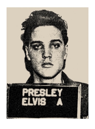 Elvis Presley FBI mugshot reproduced in stunning metallic silver and black duotone.