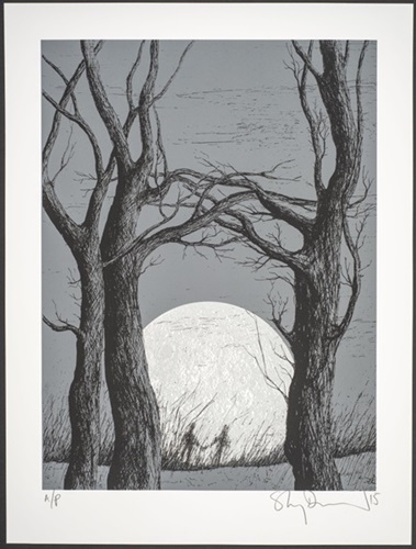 THIS PRINT IS BASED ON A DRAWING I MADE FOR A BOOK CALLED ABC, WHICH WAS A LIMITED EDITION TITLE PRODUCED BY MA STUDENTS FROM THE LONDON COLLEGE OF COMMUNICATION; IT WAS INTENDED TO RAISE MONEY FOR, AND AWARENESS OF, THE BRITISH RED CROSS. MY LETTER WAS H. THE DRAWING ITSELF WAS SNAPPED UP AT MY FINAL SOHO EXHIBITION IN 2013. I'VE ADDED A SILVER-PRINTED MOON, WHICH IS FROM A NASA PHOTOGRAPH OF THE OTHER, 'DARK' SIDE OF THE MOON. THESE PRINTS ARE HAND-PULLED USING THREE COLOURS ON SOMERSET SATIN PAPER FROM ST CUTHBERTS MILL IN WELLS.