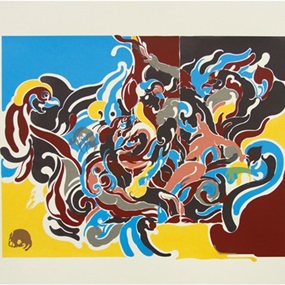 This new work is a broken abstraction illustrated from a painting of his signature black and white motifs. Four opposing colors overlap and reveal other images emerging from the darkness of translucent layers.