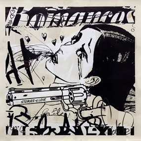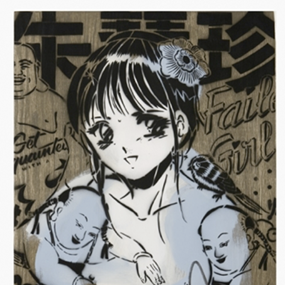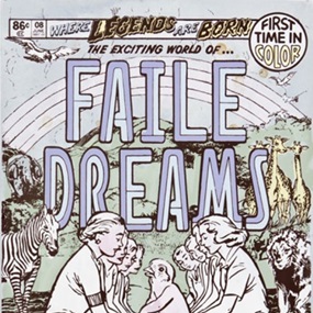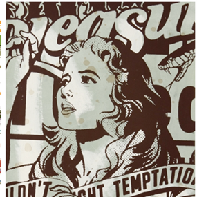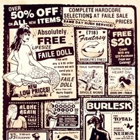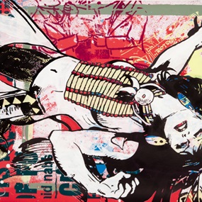This 18 layer screen print is inspired by their current wood paintings, which utilize sculptural elements such as wooden pallets and blocks. The vibrant colors in this print work great alongside the playful imagery of a modernized Mary Poppins. In addition, Faile are having a fun little giveaway influenced by Tootsie Pops shooting star icon. Find the Faile candy stamp on the back of your print, and you get a little treat.