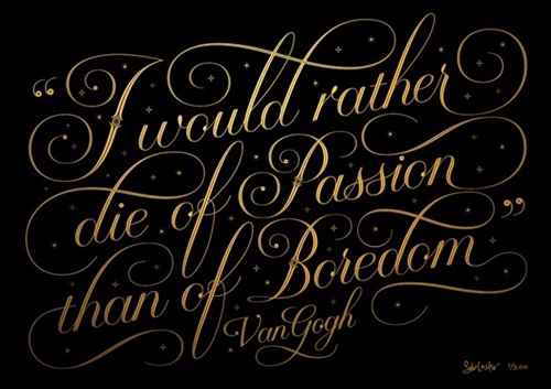 "I would rather die of passion than of boredom." - Vincent van Gogh. Screen printed by hand, black ink on 'Majestic Real Gold' paper, 250gsm. Signed & numbered by the artist, edition of 200. 594mm X 420mm (23.4inches X 16.5 inches). This edition is the second and final colourway of 'Passion', no more will be available when this edition sells out.