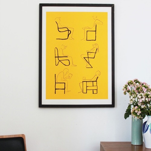 The sensation of travelling quite far to a remote location, which has a lot to offer, felt a bit like a treasure hunt. The dynamic in Marfa is very interesting, it's a great mix of people, and the architecture is fantastic. The town also seemed to have its own sort of mythology, from the Marfa Lights, to Donald Judd, to the movie Giant, etc. I spent a lot of time drawing the old school cars, the houses and the desert landscape. For a French person from Brittany, it felt like I was a long way from home! For my print I made a series of line drawings inspired by the chairs collected by Donald Judd. I drew lots of them from all angles but loved how they could be reduced to odd lines from the side."
