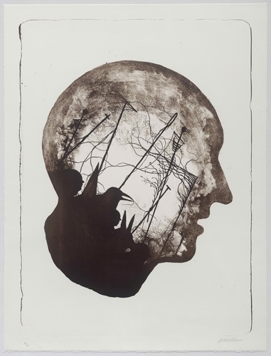 This lithograph represents a face, it’s a topic that interests me particularly since I worked a lot on it. This face contains inner characters which can represent consciousness. It’s a figure that represents the idea of fighting from the inside to the outside. I think it's a special metaphor: an open metaphor that can not really be built because it can mean many things at once."