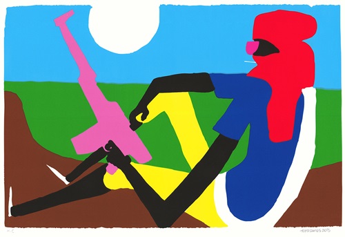 Todd James is one of a select group of creatives who've begun their careers as a graffiti legend and made the leap to an internationally recognised artist. His Street Market installation in collaboration with Barry McGee and Steve ESPO Powers is seen as one of the defining pieces of the urban art genre. Todd James's "Somali pirate" paintings, neon tributes to the ingenuity of the dispossessed, are among his most sought-after works. The screen print edition Come Sail Away is a new colour treatment of the rarely seen Somali pirate painting of the same name. Bask in its day-glo glory.