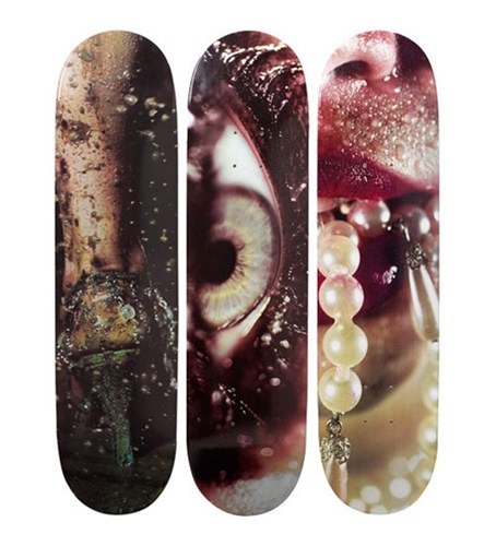 Continuing with their ongoing series of artist designed collaborations, Supreme has looked to American artist and photographer Marilyn Minter to create a series of skate decks by the controversial artist. Her rise to prominence started in 1989 where her debut show was inspired by hardcore pornography drawing a barrage of criticism from feminists. However, Minter continued on utilizing pornographic imagery and beauty advertisements together. The decks will release April 10th.