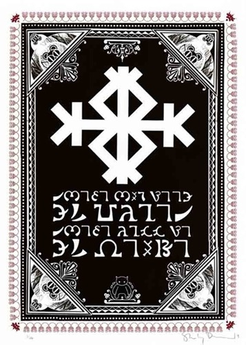 ‘The Minotaur’ is an ancient Greek myth of a monster, half-man half-bull, imprisoned in a maze. A triumph of his imagination, Stanley’s maze is based on the classical labyrinth pattern but given a post-apocalyptic flavour – three occult paramilitary organisations are fighting for control over it, and these images are their propaganda. The titles of the latter three prints (above) evolve from the text on each, which is written in Enochian script, supposedly the language of angels devised by Queen Elizabeth 1st’s court magician. The extremely distinct designs also feature the ‘Modified Bear’ Radiohead logo which first appeared on the LP 'Kid A'.