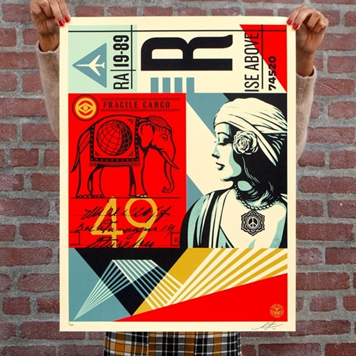 This OBEY Fragile Cargo poster is a fusion of a few inspirations. The elephant and my wife Amanda meditating relate to the Buddhist philosophy that humans are part of nature, not above it, and must live in harmony with nature. The phrase "Rise Above" references transcendence, but is also one of my favorite Black Flag songs. The graphic elements also reference the aesthetics of travel tags and tickets which present a dichotomy… travel is great for broadening cultural perspective, but it has a heavy carbon impact. Karma asks us to consider the benefits and consequences of all of our actions. All of my prints are printed on recycled or sustainable paper.