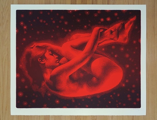 Hand-pulled screenprint made with master printer Tony Clough at Serio Press in Pasadena, California. Serigraph printed using three colors with five thin layers of clear ink over the linework.