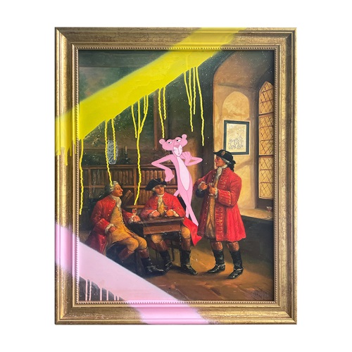 This artwork is based on the first painting "FAKE" from the unique series from 2018. The scene takes place in the Baroque era. Three gentlemen chatting and drinking with the modern signature Pink Panther character from Glod. The space incorporates other artwork by artist Glod. Like the artwork "Push the Art" from the Malaga series or the typography vase from 2022.