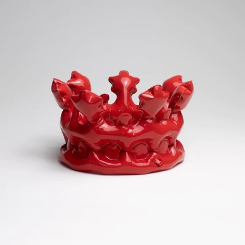The glossy red bronze crown titled Crown Volume I is a tongue in cheek representation of the monarchy and how "pumped up" it appears to be. On the flip side, I really had fun making something ordinary… extraordinary.