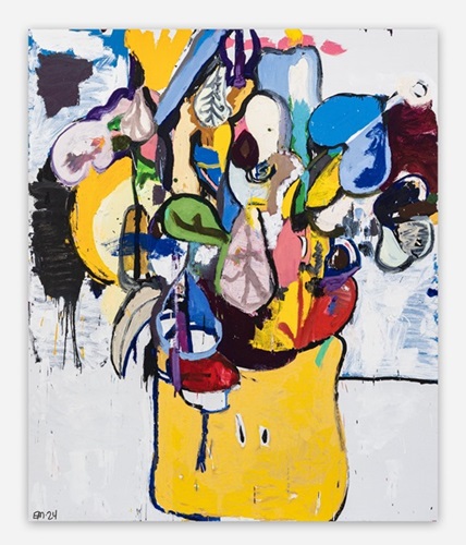 A vase of flowers becomes a vessel for colour, line and shape in a print by Eddie Martinez.