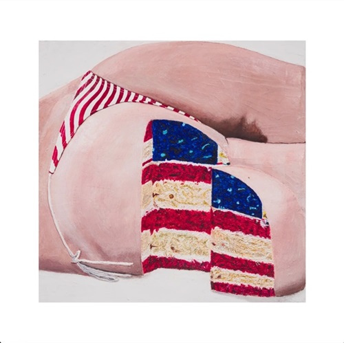 American Flag Sponge Butt Cake is a print of a realistic woman's body revealed to be cake, in the form of an American Flag 'sponge' cake. This piece is from a series of surrealistic paintings of the body Beavers has made that mine the trends and attitudes of social media. Intended as a re-framing of consumption and desire within contemporary culture, the work—rendered onto a square plane that recalls Instagram posts—evokes both the hypersexualized images and food porn trends that pervade social media. In Beavers's own words, "I am trying to make paintings that embody the anxieties, pieties, shamelessness, and vulnerabilities of our lives online. Can bodies, or a painting of a body, represent these interior states?" For the hand-embellished prints in this limited edition series, the artist has arranged a set of stickers that address themes of voting and democracy which are adhered in various places on the print.