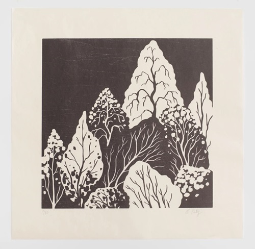 This edition is the latest in a series of intricate woodcut prints by the artist. The subject matter of the print closely relates to Party's exhibited work; an immersive mural of a fairytale forest, which performs the backdrop to Max Ernst's ominous 1927 painting Cage, Forest and Black Sun.