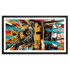 "This piece was created in July of 2012 using aerosol & acrylics on canvas. The original piece is large at 59×68 inches and was the centerpiece for my solo show ‘Truth in Myth’ at WhiteWalls Gallery in San Francisco. It's part of an ongoing series of dual face masks I’ve been painting, playing around with since 2008. This is the most developed version so far and essentially represents my interest in self-identity, duality and fantasy themes. I would say about 1-2 weeks in painting process.