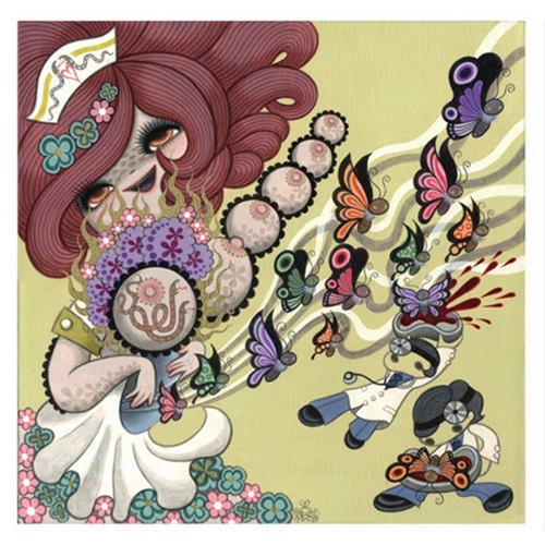 This limited edition gicleé is signed and numbered by the acclaimed artist Junko Mizuno. It is a reproduction of her favorite painting featured in her Flora Delirium solo. The artist continues to reprise the character of the nurse as she is interested in her role at the cusp of life and death.
