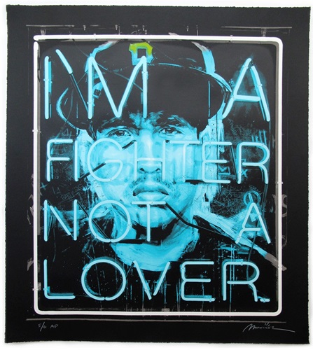 Patrick Martinez’s most recent print “Hate and Love (Fighter)” is a serigraph reproduction of his 2011 mixed media piece. The original was executed in a mixed media on acrylic plex and neon which measures 48" x 40". This piece was first shown at Martinez’s solo show at Known Gallery entitled “HUSTLEMANIA” The piece represents the warrior instinct side of humans and the simple yet complex idea of love and hate.