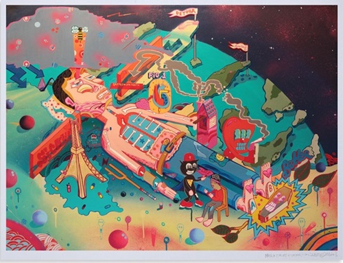 To celebrate the success of Sickboy's London show 'Make It Last Forever' at the Outsiders gallery which opened last Thursday, we have a special print release of the artist's favourite painting from the exhibition, "A Lovely Cloak Of Worry". We have gone all out with the production of this large format print and sprinkled it up with gold leaf and spot varnish, enjoy.