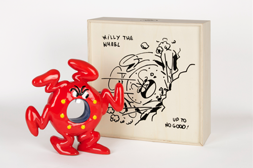 Resin sculpture sized 25cm. x 25cm. in an edition of 8 + 4 AP’s. Comes in a wooden box with silkscreened drawing of ‘Willy the Wheel’ with a signed and numbered certificate by the artist.