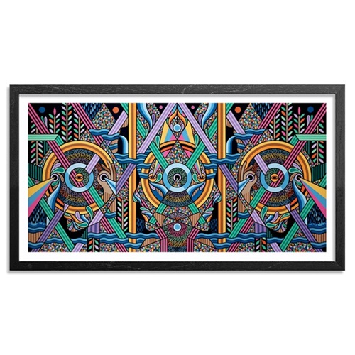 This painting generated itself organically out of geometry. It started with a measured grid layout, then the shapes, lines and forms all got worked out of the measurements. Then different aspects are repeated, mirrored or alternated throughout the painting. The core idea of the symmetry and the human profiles were developed in an initial pencil sketch up of the artwork, then other details were refined well into the actual painting, which is a patient process of layering acrylic paint followed by ink outlines, then more final acrylic details." - Beastman